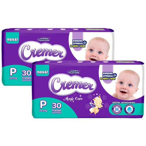 A nova fralda Cremer agora está mais fina e mais confortável, com proteção até 12h contra vazamentos! Além disso a fralda conta com um novo sistema antivazamento, composto por uma nova fita abre e fecha mais flexível e orelhas maiores que se ajustam ao corpinho do bebê, e uma camada super absorvente que distribui rápido o xixi pela fralda e evitando o retorno do líquido e garantindo que a pele do bebê fique bem sequinha. A nova Cremer traz proteção para noites tranquilas e dias mágicos, ainda mais confortáveis. • 12 horas de proteção para um bebê sempre sequinho e tranquilo; • Combinação de gel e barreiras altas que proporcionam absorção rápida e maior proteção contra vazamentos; • Camada superabsorvente que distribui rápido o xixi pela fralda e evita o retorno do líquido, garantindo que a pele do bebê fique sempre bem sequinha; • Nova fita mais flexível que abre e fecha quantas vezes for necessário sem estragar a fralda e orelhas maiores para mais conforto do bebê; • Cobertura externa macia e confortável como um tecido; • Cheirinho Encantador; • Dermatologicamente Testado. Ean: 7898133019555