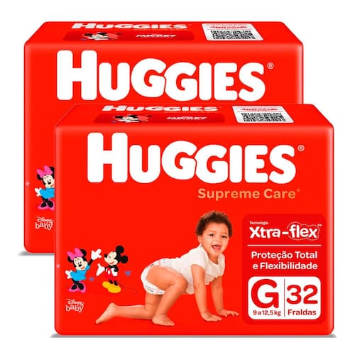 Fralda Descartável Huggies Máxima Proteção Tamanho G com 32 unidades A Fralda Descartável Huggies Máxima Proteção Tamanho G, com 32 unidades, foi feita para acompanhar cada movimento do seu bebê com conforto e segurança. Supreme Care agora é Máxima Proteção: com absorção 5X mais rápida* e tecnologia Xtra-Flex, ela se adapta ao corpinho do bebê e distribui o xixi de forma rápida e uniforme. Assim, ajuda a evitar fralda caída mesmo quando cheia. Seu ajuste anatômico mantém a fralda no lugar, permitindo que o bebê brinque, se mova e explore com liberdade. Tudo isso com máxima proteção e até 12h/ proteção anti vazamentos** *Comparação feita com fraldas convencionais sem canais de absorção no segmento de fraldas que são usualmente vendidas na mesma faixa de preço **Desempenho da fralda pode variar com os hábitos, alimentação e características do bebê. Ean: 7896007548415