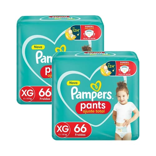 Fralda Pampers Pants Ajuste Total Tamanho XG com 66 Unidades Experimente a nova Pampers Pants ajuste total! Com cintura elástica 360 é fácil de pôr mesmo quando eles estão em movimento, para um ajuste perfeito e até 12 horas sequinho. O jeito fácil de trocar. Fácil de pôr. Cintura elástica 360° que se adapta ao corpinho do seu bebê e agora com sistema de Ajuste Inteligente. Fácil de tirar rasgue suas laterais e retire-a normalmente. Canais de ar que evitam que a fralda fique caída. Até 12 horas de proteção para noites inteiras de sono sequinho. Pode variar de acordo com os hábitos e características do bebê. Modo de Uso: Fácil de vestir, ajuste 360°, fácil de retirar. Composição/Material: Sodium polyacrylate, polypropylene, cellulose, adesivos, polyethylene, polyester, elásticos, petrolatum, stearyl alcohol, parfum e aloe barbadensis leaf extract. Ean: 7500435146494