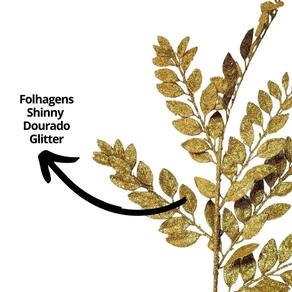 Com acabamento em glitter brilhante na tonalidade dourado, a haste mede 85cm de comprimento total — sendo 45cm de folhagem e 40cm de haste — oferecendo versatilidade para diversas composições decorativas, tanto em ambientes internos quanto em vitrines e espaços comerciais.