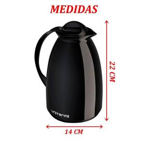1 Garrafa Térmica Preta com 22cm de altura e 14cm de diâmetro;1 Garrafa Térmica Branca com 22cm de altura e 14cm de diâmetro;