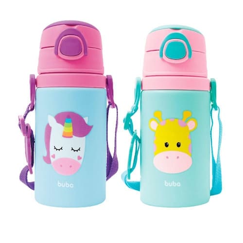 Kit 2 garrafinhas de alumínio antivazamento infantil bebe suco água com canudo retrátil silicone animal fun Cor: unicórnio/girafa A garrafinha animal fun girafa da buba e ideal para qualquer hora pode ser utilizada para armazenar agua, sucos e chás. Produzida em alumínio, e resistente e higiênica. Possui canudo em silicone, tampa com trava de segurança e cordinha antiqueda. Perfeita para levar em passeios e viagens.