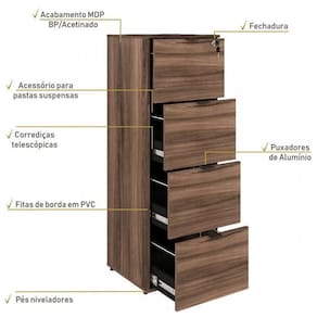 O arquivo para pastas suspensas KUAQ40 tem um design diferenciado, possui 04 gavetas sendo 01 com chave, além dos puxadores de metal e corrediças telescópicas que dão mais suporte a peso e segurança. Pode ser utilizado em diversas composições com outros móveis, sendo perfeito para fazer parte do seu escritório ou sala. A linha Kuadra tem seu design com inspiração no estilo industrial, que remete muito a decoração usada nos lofts das grandes metrópoles nos anos 60 e 70. Harmonizando o metal e os tons de madeira, foram projetados móveis versáteis e com estilo, que podem compor ambientes flexíveis cheios de personalidade, perfeitos para você decorar sua casa ou seu trabalho, tendo um resultado que caminha do estilo rústico ao moderno. Suas estruturas são fabricadas em aço, com soldas suavizadas e pintura texturizada epóxi-pó, conta com pés niveladores de altura e parafusos na cor preta. Para os tampos são utilizados mdp-bp acetinado com fitas de borda em pvc, dando uma maior durabilidade ao seu móvel. Altura do Conjunto: 136.5 cm Ambiente: null Ambiente Principal: Escritório Cor: Marrom Informação Complementar: 2x Gaveteiro Arquivo 4 Gavetas para Pastas Suspensas Kuaq40 Kuadra Nogal/Preto Ônix Largura: 45,5 cm Altura: 136,5 cm Peso: 31,69 kg Profundidade: 43 cm Necessita Montagem: Sim