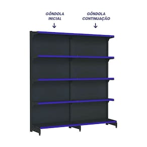 \nNosso kit com 2 gôndolas de parede na cor preta é ideal para armazenamento e exposição de produtos em supermercados, mercearias, farmácias, lojas de utilidades, materiais de construção, agropecuárias, e muito mais, variando de acordo com a capacidade de peso de cada modelo.com 2,02m de altura, esta gôndola proporciona uma exibição eficiente dos produtos, maximizando o espaço vertical da sua loja e permitindo uma organização prática e acessível.as gôndolas possuem uma capacidade de 40kg por bandeja. com pintura eletrostática epóxi, antibacteriana, uniforme e resistente.possui bandejas com inclinação em 3 posições e bandejas reguláveis na coluna a cada 25mm, o que permite adição de bandejas extras. a bandeja é construida em chapa 26 (espessura de 0,50mm). fundo da bandeja quadrado para melhor exposição.pés com regulagem de altura, colunas dupladas e tratamento especial da superfície.a gôndola é prática e fácil de montar, com sistema de encaixe sem utilização de parafusos. você pode instalar suas gôndolas rapidamente, sem complicações, permitindo que você comece a exibir seus produtos em pouco tempo.todas as nossas gôndolas possuem qualidade, resistência e durabilidade garantidas pelo uso de matérias-primas de alto padrão, processos produtivos com a mais atual tecnologia e um cuidado especial em cada etapa.modernas e elegantes, nossas gôndolas são projetadas para destacar seus produtos e criar um ambiente agradável de compras para seus clientes, incentivando a exploração e aumentando as vendas.aproveite ao máximo cada centímetro disponível em sua loja com nossas gôndolas projetadas para maximizar o espaço de exposição, permitindo uma ampla variedade de produtos em um layout eficiente.- capacidade de 40kg por bandeja;- colunas dupladas: com sistema de encaixe, sem utilização de parafusos;- tecnologia exclusiva de apoio sgl;- pés reforçados e com regulagem;- bandejas inclináveis: oferece 3 opções para melhor exposição;- bandejas reguláveis a cada 25mm: possibilidade de adicionar bandejas extras;- reforço na base e bandeja: para maior capacidade de carga e estabilidade;- bandeja é construida em chapa 26;- ponteira da coluna: maior proteção e durabilidade.*porta etiquetas: vendidos separadamente, em variadas opções de cores.> o kit contém- 01x gôndola new premium 2,02m preta parede inicial- 01x gôndola new premium 2,02m preta parede continuação> especificaçõesgôndola parede inicialmodelo: gôndola de centro iniciallinha: fit 40altura: 2,02mcor: pretaquantidade de bandeja: 5peso suportado por bandeja: 40kgchapa: 26gôndola parede continuaçãomodelo: gôndola de parede continuaçãolinha: fit 40altura: 2,02mcor: pretaquantidade de bandeja: 5peso suportado por bandeja: 40kgchapa: 26> medidas do produtogôndola parede inicialaltura: 2,02mlargura: 0,96mpeso: 26kglargura da bandeja: 0,90mprofundidade da bandeja base: 0,40mprofundidade das bandejas superiores: 0,30mgôndola parede continuaçãoaltura: 2,02mlargura: 0,93mpeso: 20kglargura da bandeja: 0,90mprofundidade da bandeja base: 0,40mprofundidade das bandejas superiores: 0,30m> garantia- 6 meses> troca e devoluçãomediante termos da política de trocas e devoluções da empresa.