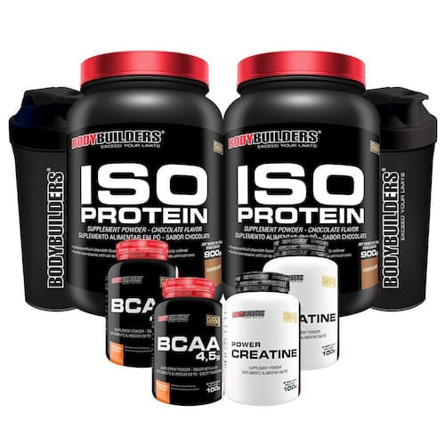 Kit 2x Iso Protein 900g + 2x BCAA 4.5 100g + 2x Power Creatina 100g + 2x Coqueteleira - Bodybuilders Sabor: Chocolate O que compõe o kit:- Whey Protein Isolado: 2 potes de 900g- BCAA 4.5: 2 potes de 100g- 100% Creatina: 2 potes de 100g- Coqueteleira: 2 coqueteleira de 600ml O Whey Protein Isolado é um suplemento proteico em pó para atletas. Sua fórmula de fácil absorção é uma importante fonte de energia ao organismo, além de ideal para o aumento da oferta proteica e preservação da massa. Recomenda-se uma dose diária após o treino. O BCAA 4.5 BODYBUILDERS promove uma maior recuperação muscular e aumento da resistência no pré e pós-treino, fornecendo um maior efeito anti-catabólico sendo um importante suplemento alimentar para ganhos de massa e recuperação muscular.Ingredientes: é um suplemento alimentar composto pelos 3 aminoácidos essenciais de cadeia ramificada, L-Leucina, L-Isoleucina e L-Valina A 100% CREATINE BODYBUILDERS é usada pelo tecido muscular para a produção de fosfocreatina, fator importante na formação de adenosina trifosfato ATP , que funciona como um repositor de energia. Recomenda-se a ingestão com água, ou conforme orientação de um médico ou nutricionista.Ingredientes: Creatina Monohidratada. Sugestão de consumo:A Whey Protein Isolado: Misture aproximadamente 60g 4 colheres de sopa em 250ml de água. Recomenda-se uma dose diária após o treino.B BCAA - Sugere-se 1 porção de 5g 1 colher de chá diluída em 200ml 1 copo de água. Consumir após o treino ou conforme orientação profissional.C Creatina - dissolver 3g 1 colher de café em 100ml 1/2 copo de aguá, uma porção ao dia.