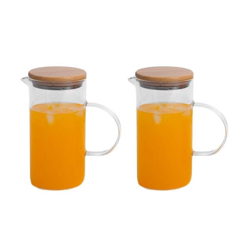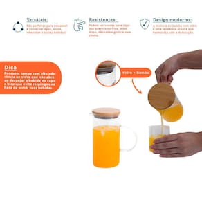 "Conheça o Kit com 2 jarras de vidro com tampa de bambu 750ml da Oikos.Práticas, versáteis, higiênicas e com design decorativo, são perfeitas para servir bebidas da geladeira para sua mesa no dia a dia e naquele almoço especial no final de semana. Pode ser usada para líquidos quentes ou frios. Além disso, não retém gosto e cheiro e são fáceis de limpar!Possui tampa com alta aderência ao vidro que não abre ao despejar a bebida no copo e bico em v que evita respingos na hora de servir suas bebidas. São de vidro borossilicato e bambu. Podem ser lavados em água corrente com esponja e detergente. O bambu não pode ficar imerso em água.Leve qualidade e modernidade para sua casa!O kit contém:2 jarras de vidro com tampa de bambu 750ml"