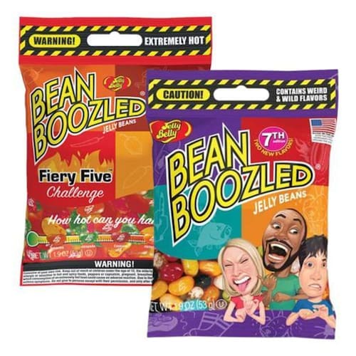 Jelly beans BeanBoozled vêm em 20 sabores: 10 estranhos e selvagens emparelhados com 10 sabores saborosos semelhantes. Mas aqui está o problema - você não saberá qual sabor vai obter até experimentá-lo Uma chave na parte de trás da caixa mostrará a aparência de cada sabor, mas o feijão é tão parecido que cada mordida será um desafio surpreendente.