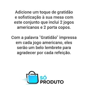 Adicione um toque de gratidão e sofisticação à sua mesa com este conjunto de jogos americanos em plástico Gratidão. Com 4 peças, o conjunto inclui 2 jogos americanos e 2 porta copos.