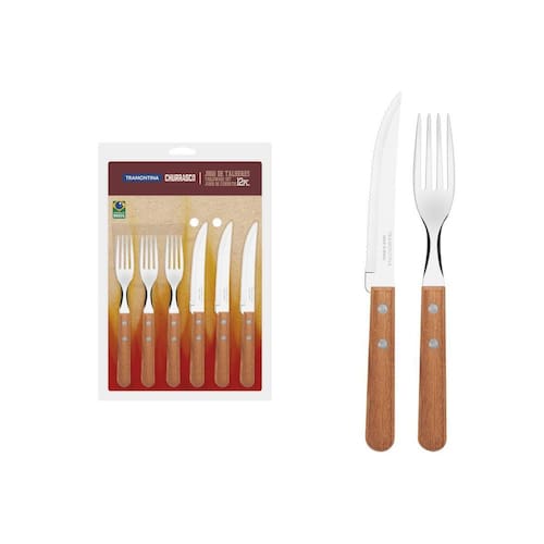 O churrasqueiro é sempre o último a sentar à mesa. Mas para garantir que os convidados também tratem o assado com respeito, nada melhor do que escolher os talheres certos para isso. A linha Churrasco da Tramontina tem cabos de madeira, que resistem ao tempo e à umidade, e lâminas em aço inox para garantir o corte perfeito das carnes. Lâminas de aço inox. Cabos de madeira natural. Rebites de alumínio. Uso seguro e adequado Antes da primeira utilização, lave bem as peças e seque-as. Tenha cuidado ao manusear produtos cortantes e perfurantes e mantenha-os fora do alcance de crianças. Para maior durabilidade dos produtos, recomenda-se secar bem antes de guardar. Para descarte dos produtos e embalagens siga as orientações de reciclagem vigentes. Ficha técnica - Cor: Inox Medidas aproximadas do produto - Comprimento: 3,5 cm - Altura: 31,5 cm - Largura: 22 cm - Peso: 340 g Ean: 07891112091191