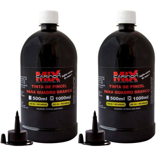 Kit 2L litro na cor preta.Marca: Carinon MixO Produto: - Não Mancha Os Quadros,- Fácil Remoção,- Cores Fortes E Vivas Para Melhor Visualização,- Frasco Com Bico Aplicador Para Facilitar A Injeção Nos Refis E Pincéis,- 20 Recargas.Ideal Para: Uso Comercial, Escolar. Para Pincel Marcador De Quadro Branco.Dimensões: Compr. 160 Mm Larg. 95 Mm Diâm. 290 Mm.Embalagem: 2 Unidade De 1L cadaCor: Preto