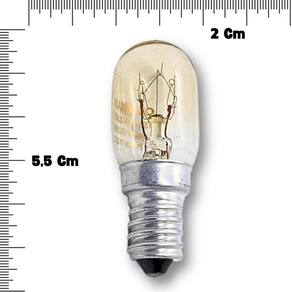 - potência: 15w - proporciona uma iluminação eficiente e clara. - voltagem: 127v - compatível com a maioria dos micro-ondas,geladeiras,fogão e eletrodomésticos. - base: e14 - rosca pequena que facilita a instalação em diversos aparelhos. - garantia: 3 meses - tamanho do produto: 5,5cm altura x 1,5cm largura - cor da luz: branco quente 2.200k - modelo: t-22 / mini bulbo - composição: vidro e metal - validade: indeterminada