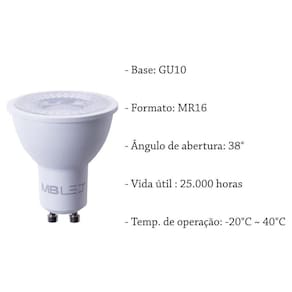 - base: gu10 - formato: mr16 - temperatura de cor: 3000k branco quente - tensão: bivolt - potência: 6w - fator de potência: 0.70 - fluxo luminoso: 417lm - eficiência luminosa: 69,5lm/w - ângulo de abertura: 38 - vida útil : 25.000 horas - temp. De operação: -20c 40c Ean: 7891072777487