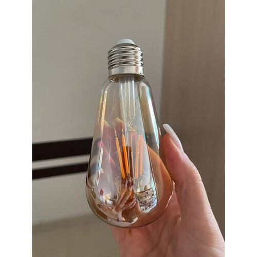 Lâmpada filamento de led st64 4,5w equivale a uma fluorescente de 12w e incandescente de 50w base da lâmpada: e27 cor da lâmpada: âmbar fumê potência w : 4w dimensão: 14,3 cm l x 6,4 cm a vida útil: 20.000h grau de proteção: ip20 ângulo de abertura: 360º fator potência: 0,5 tensão:85-265v ac