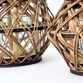 Ambos os castiçais são feitos de madeira com acabamento vazado, permitindo que a luz da vela escape suavemente e crie efeitos visuais encantadores. Cada um possui uma alça de corda que facilita o transporte ou permite pendurá-los, adicionando um detalhe rústico e prático às peças. No interior, há um copo de vidro removível, ideal para acomodar velas não inclusas e garantir a segurança, além de facilitar a limpeza e a troca.