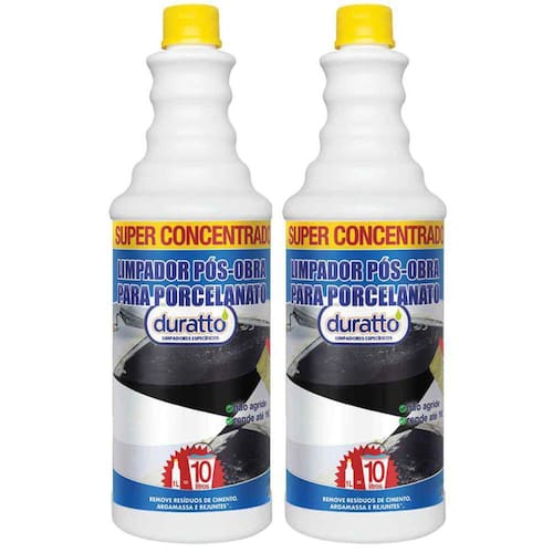 Kit 2 Limpador Pos Obra Para Porcelanato Duratto 1Lt Cada 2 limpador pos obra para porcelanato duratto 1ltDescrição - produto para limpeza pós-obra de porcelanatos; - limpa e remove excesso de rejuntes inclusive de base epóxi ; - remove resíduos de cimento, argamassa, gesso e etc; - remove marcas de ferrugem e resíduos impregnados.Observação: aguardar 72 horas após o rejuntamento para utilização deste produto. Embalagem: 1l Rende até 100m / litro Produto concentradoIndicação de uso Usar em porcelanato polido, esmaltado, rústico, gloss e hd.Modo de usar 1- diluir o produto conforme tabela abaixo; 2- espalhar sobre a superfície com o auxílio de uma vassoura; 3- deixar agir por 5 a 10 minutos; 4- esfregar utilizar uma vassoura tipo piaçava, escova ou outro material similiar ; 5- enxaguar para remoção dos resíduos. Repetir a operação caso não remova completamente os resíduos.