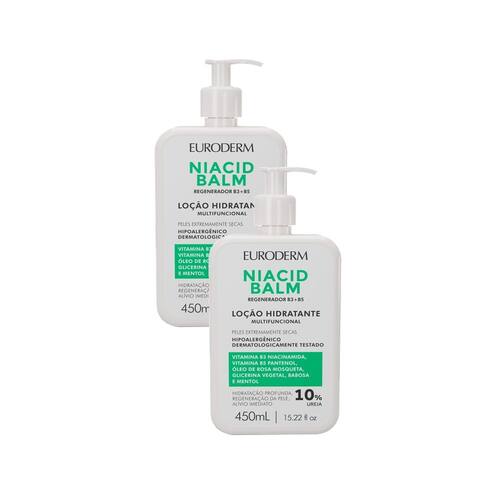 Loção Hidratante Euroderm Niacid Balm – Regenerador B3+B5, 450ml A Loção Hidratante Euroderm Niacid Balm foi desenvolvida para proporcionar hidratação intensa e profunda, especialmente para peles extremamente secas e sensibilizadas. Sua fórmula avançada combina Niacinamida (Vitamina B3) e Pantenol (Vitamina B5) para ajudar na regeneração da barreira cutânea, além de conter 10% de ureia, garantindo uma hidratação duradoura e eficaz. Enriquecida com óleo de rosa mosqueta, glicerina vegetal, babosa e mentol, essa loção multifuncional proporciona alívio imediato, suaviza a pele e melhora sua elasticidade. Dermatologicamente testada e hipoalergênica, é ideal para um cuidado diário que restaura a saúde e o conforto da pele. Experimente um verdadeiro tratamento hidratante e regenerador! Marca: Não Informado