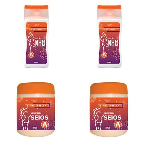 2 Loções Que Auxiliam a Aumentar Bumbum a E 2 Cremes Que Auxiliam a Aumentar Seios a Lucy's 2 potes Loções Que Auxiliam a Aumentar Bumbum A 130ml e 2 potes Cremes Que Auxiliam a Aumentar Seios A 100g - Lucys Este kit contém: 2 Loções Que Auxiliam a Aumentar Bumbum A Com Commipheroline e Adipofill Esbelta Lucys 130 ml 2 Cremes Que Auxiliam a Aumentar Seios A Com Commipheroline e Adipofill Esbelta Lucys 100gr Por ser um produto natural, pode ser utilizado por mulheres de qualquer idade, pois não age nos níveis de hormônio da pele e sim na deposição de gordura. O volume pode variar, pois cada pessoa responde de maneira diferente ao produto. O produto deve ser Utilizado por, no mínimo, por seis semanas. Commipheroline é um ativo de origem vegetal que auxilia no aumento de volume do bumbum e dos seios. É extraído da árvore indiana Commiphora mukul, utilizada há séculos na medicina Ayurvédica. A ideia deste produto não é alterar definitivamente o tamanho do bumbum ou seios, mas sim estimular que as células de gordura acumulem mais gordura do que de costume, aumentando cerca de 2 a 4cm o tamanho das nádegas e seios. O Adipofill estimula o preenchimento de células adiposas células de gordura nos locais onde é aplicado, auxiliando ainda mais no processo de preenchimento.Na embalagem, os nomes dos componentes seguem o padrão científico por exigência da Anvisa. Modo de usar: No bumbum: Aplicar com massagem suave, por todo o bumbum, com movimentos no sentido de baixo para cima Movimento ascendente que inicia na base da nádega, junto à coxa .Nos seios: Aplicar com massagem suave, por todo o seio, com movimentos no sentido de baixo para cima Movimento ascendente que inicia na base da mama Ean: 7891038264808