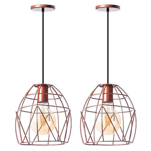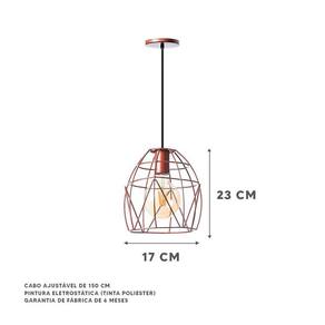 Especificações Técnicas: Marca: Ideallume Modelo: Aramado Fixação: Teto Tipo de uso: Interno Pintura: Eletrostática - Tinta: microtextura poliéster Cor: Cobre Voltagem Do Pendente: Bivolt 110/220v Soquete: E27 Medidas (L x A x D): 17 x 23 x 17 cm Lâmpada: Utiliza 1 lâmpada (Não inclusa)