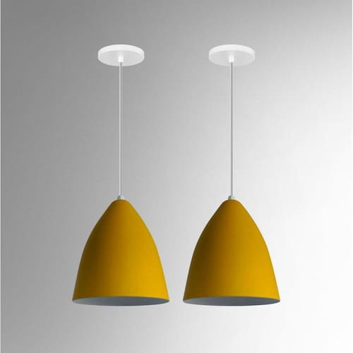 Kit 2 lustre pendentes vegas amarelo com branco r.R.J.V Anuncio referente a 2 unidadesLustre pendente Modelo: vegas Cor: amarelo com branco Medidas aproximadas: Altura: 20 cm Diâmetro: 15 cm Canópla de teto: 12 cm Soquete e-27 plástico Material: alumínio Marca r.R.J.V negócios O pendente acompanha 1 um metro de fio com altura ajustável. Marca: R.R.J.V. Negocios