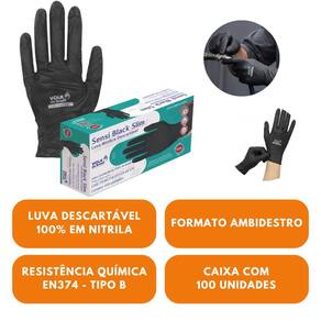 Kit Com 2 Luva de Segurança Nitrílica Descartável Sensi Black Slim Volk do Brasil
