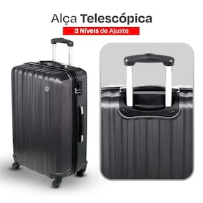 A mala é confeccionada em ABS texturizado, que é durável e fácil de limpar.