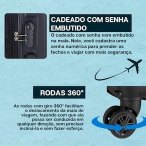 O cadeado com senha vem embutido na mala. Nele, você cadastra uma senha