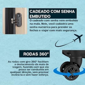O cadeado com senha vem embutido na mala. Nele, você cadastra uma senha