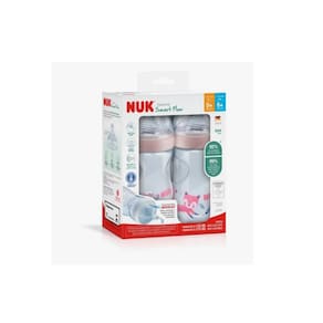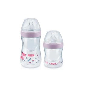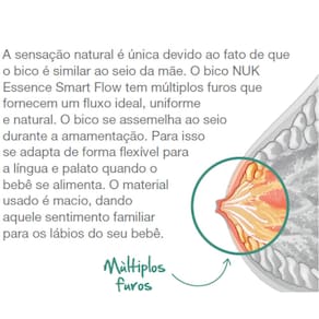 O Kit com duas Mamadeiras Anticólica NUK Essence Smart Flow possui bico com tecnologia inovadora composta por sistema de fluxo de líquidos com múltiplos furos, que variam em quantidade, para garantir a saída adequada de líquido conforme a consistência de cada alimento.
