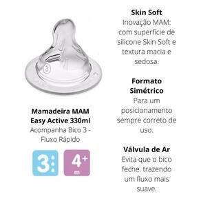Kit 2 mamadeira mam easy active - 330ml 4+ meses Cor: azul/neutra Bico mam com tecnologia skinsoft, macio com superfície texturizada e sedosa. Design funcional - confortável de segurar, ideal para mãos pequenas Abertura ampla - facilita o enchimento e a limpeza Tampa graduada - pode ser Utilizado para medir volumes e manter o bico protegido Acompanha bico de fluxo rápido Livre de bpa e bps Compatível com diferentes tamanhos de bicos mam Ce-pur/iqb 000153 nbr 13793 - ocp 006 Marca: Não Informado