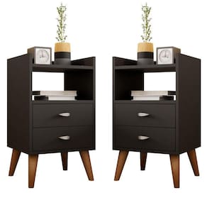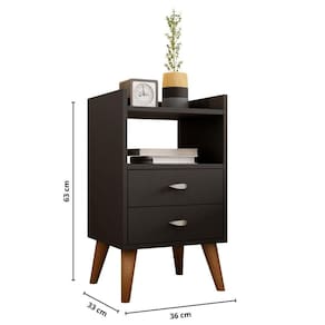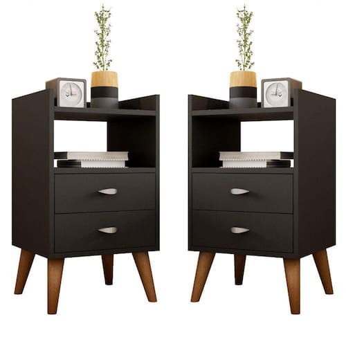 Com pés em madeira maciça estilo retrô, esta Mesa de Cabeceira é perfeita para as laterais da sua cama. Possui duas gavetas com amplo espaço interno e puxadores cromados.