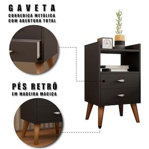 * Embora o produto acompanhe o manual de montagem e seja bem simples, verifique a complexidade antes de decidir montá-lo s Acabamento da Gaveta: BP Acabamento da Prateleira: BP Acabamento dos Pés: Verniz Altura dos Pés: 17 Ambiente Principal: Quarto Complexidade da Montagem: Baixa: pode ser montado por uma pessoa sozinha Cor: Preto Cor do Produto: Preto Cor Interna: Branco Escala de Brilho: Fosco Escala de Brilho da Gaveta: Fosco Escala de Brilho da Prateleira: Fosco Gaveta com Chave: Não Itens Inclusos: 2 Mesa de Cabeceira, Kit Para Montagem e manual de Montagem Manual de Montagem e Instalação: https://product-hub-prd.madeiramadeira.com.br/887546/documents/3e319f14-8d0a-4265-863b-9eedcd959d84c6d88dfc1312338mvdmm000801.pdf Material da Gaveta: MDF/MDP Material da Prateleira: MDF/MDP Material do Puxador da Gaveta: Cromado Material dos Pés: Madeira Maciça Material Principal: MDF/MDP Necessita Montagem: Sim Origem do Produto: Nacional Pés Reguláveis: Não Peso: 9.6 Peso Máximo por Gaveta: 5 Peso Máximo por Prateleira: 10 Pet Friendly: Não Possui Espelho: Não Possui Possui Nichos: 01 Possui Pés: 04 Possui Portas: Não Possui Prateleiras: 01 Possui Vidro: Não Quantidade de Nichos: 01 Recomendações de Uso, Manutenção e Limpeza: Limpar com pano umedecido Sapatas Niveladoras: Não Sistema de Montagem: Parafusos e cavilhas Suporta Até (kg): 30 Tipo de Corrediça da Gaveta: Metálica Simples Tipo de Madeira Maciça dos Pés: Pinus Tipo de Puxador da Gaveta: Externo Marca: MVD