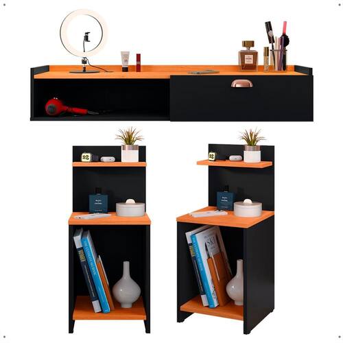 Apresentamos o conjunto Mesa de Cabeceira Fantasy + Penteadeira Suspensa Decor: elegância e organização em um só lugar.