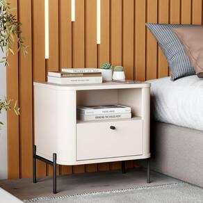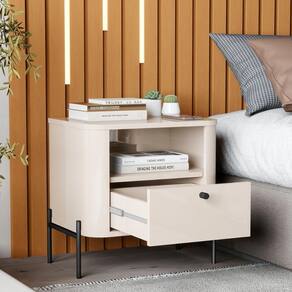 Conta com 1 gaveta com corrediças telescópicas e puxador em metal, oferecendo espaço eficiente para seus objetos essenciais.