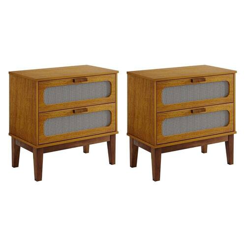AS IMAGENS SÃO MERAMENTE ILUSTRATIVAS E PODEM SOFRER VARIAÇÕES DE COR E PEQUENOS DETALHES DE ACORDO COM O SEU MONITOR, ILUMINAÇÃO DO AMBIENTE E ATÉ MESMO A SUA PERCEPÇÃO VISUAL.Kit 2 Mesas de Cabeceira 2 Gavetas Santorini Nature 60 Cm com Tela Indiana