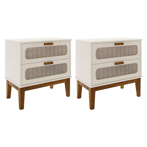 AS IMAGENS SÃO MERAMENTE ILUSTRATIVAS E PODEM SOFRER VARIAÇÕES DE COR E PEQUENOS DETALHES DE ACORDO COM O SEU MONITOR, ILUMINAÇÃO DO AMBIENTE E ATÉ MESMO A SUA PERCEPÇÃO 2 Mesas de Cabeceira 2 Gavetas Santorini Off White 60 Cm com Tela Indiana