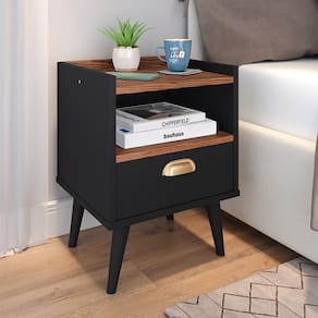 A Mesa de Cabeceira Estilo possui um charmoso nicho decorativo, uma gaveta espaçosa com puxador concha e pés palito no estilo retrô, proporcionando ao ambiente um local tanto para organizar quanto para decorar.