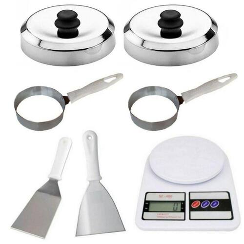 Kit 2 Modelador De Ovo 2 Abafador Kit Espátulas 01 BalançaItens que acompanham kit:Acompanham:2- abafador em alumínioMed. Aprox.: 16 cm diâmetro x 5.00 cm altura2- modelador ovos Material: aço inox, med. Aprox.: diâmetro: 10 cm, altura: 2 cm1- espátula curvaMed. Aprox.: 27 comprimento x 90 mm largura1- espátula retaMed. Aprox.: 25 comprimentos x 100 mm largura1- balança digital de alta precisãoPesa de 1 grama até 10 kg.