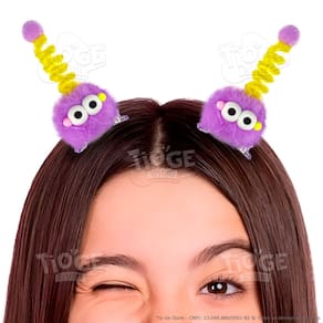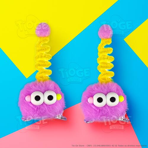 Itens da Embalagem: - 2 Monstrinhos Bolinha de Pelúcia Antena Espiral Presilha Cabelo Maluco Bichinho Olhos Grandes Fofo Engraçado na cor Roxo e Amarelo.