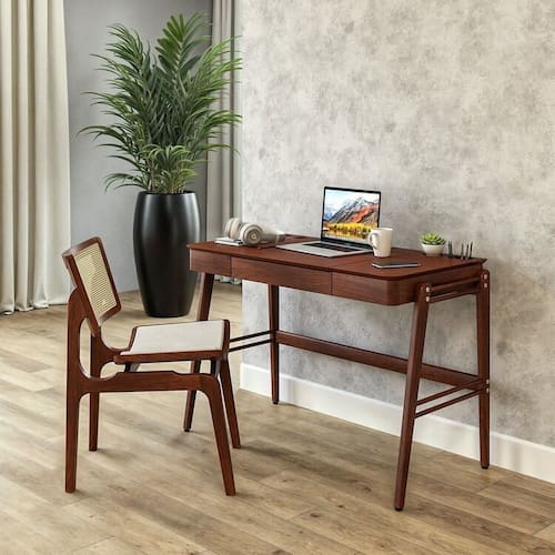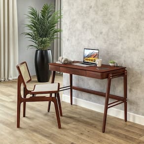 A Escrivaninha Joy é a solução ideal para quem busca uma peça prática e moderna para o seu home office. Fabricada em madeira de eucalipto e MDF laminado, ela é uma escrivaninha robusta e durável, capaz de suportar o uso diário. Além disso, sua fu Acabamento: Verniz Altura do Conjunto: 83.2 cm Ambiente: null Ambiente Principal: Escritório Cor: Castanho Informação Complementar: 1x Cadeira em Madeira Maciça Veronica Castanho Largura: 48,6 cm Altura: 83,2 cm Peso: 7,74 kg Profundidade: 62,1 cm Necessita Montagem: Não