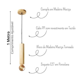 - comprimento ajustável. Máximo de 1 metro; - cabo pp com revestimento em tecido; - bloco único de madeira maciça torneada; - fabricado em madeira maciça legalizada e sustentável; - tensão/voltagem: 110/220v; - soquete padrão e27; - acompanha todo o kit para fixação: travessa, niple e parafusos;