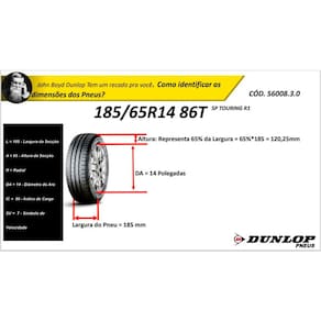 Marca: Dunlop Modelo: SP Touring R1 Medida: 185/65R14 Indice de carga: 86 -530 kg por pneu- Indice de velocidade: T -ate 190 km/h- Tipo de construcao: Radial Tipo de veiculo: Passeio Aro: 14 Largura de seccao: 185 mm Perfil: 65