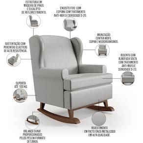 Características: Estrutura em madeira de pinus e eucalipto de reflorestamento, com imunização contra mofo, cupim e microrganismos. Revestimento em Facto Cinza Metalizado de alta qualidade. Encosto fixo com percintas elásticas, espuma D-23 e tratamento antimofo. Assento com espuma D-20, tratamento antimofo e almofada solta. Sustentação com percintas elásticas de alta resistência. Base com pés em formato de canoa e balanço suave. Peso suportado: Até 100 kg.