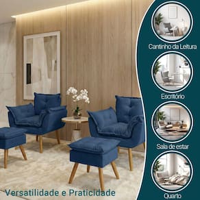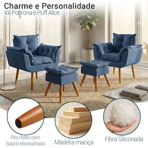 Transforme seu ambiente com o Kit Alice, composto por 2 poltronas e 2 puff, combinando sofisticação, conforto e versatilidade. Com design elegante, adapta-se a diversos estilos de decoração, desde os mais modernos aos clássicos. Ideal para salas de estar, recepções, consultórios e escritórios, esse conjunto harmoniza perfeitamente com diferentes paletas de cores e elementos decorativos. Além da estética refinada, proporciona um ambiente acolhedor e convidativo, valorizando cada detalhe do seu espaço.