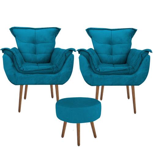 Kit 2 Poltronas Decorativa Parana com Puff Redondo Suede Turquesa - Azul Turquesa