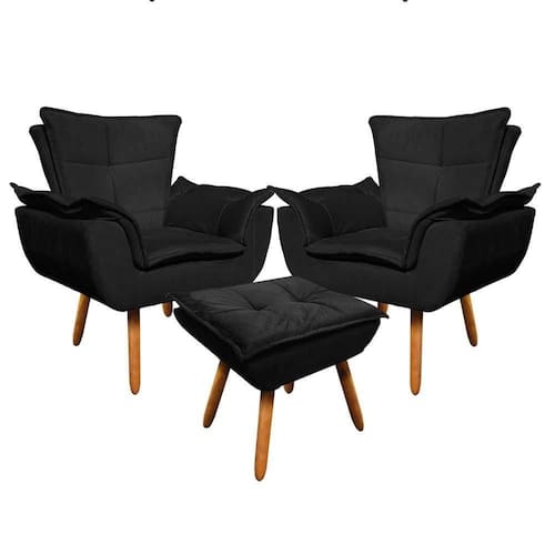ColorFamily: Preto | Requere montagem: Sim | Color: Preto | ColorSimple: Preto | ColorSupplier: Preto | AssemblyRequired: Sim, sugerimos a contratação do nosso de montagem (para os CEPs em que o está dispon | Marca: Ibiza | Peso Suportado: 120 kg | Tipo de Garantia: Fabricante | ProductWarranty: 90 dias após o do produto | Manual: Sim | OriginCountry: | Gênero: Unisex | ProductInstructions: Produto para uso em ambiente interno, nao devendo ficar exposto ao sol, calor e umidade excessivos. | ProductHeight: 91 | OriginState: PR | SupplierSimpleName: Kit 2 Poltronas Decorativas Pés Palito com Puff Opla Suede Preto - Ibiza | Altura: 91 cm | Cor: Preto | ProductWeight: 33 | Origem: | Peso: 33 kg | ProductWidth: 80 | Material: Madeira de Eucalipto | MaterialFamily: Madeira de Eucalipto | Profundidade: 62 cm | ProductLength: 62 | SizeDescription: 91 x 80 x 62 cm | Model: Opla | Largura: 80 cm | ProductContents: 2 Poltronas, 1 Puff
