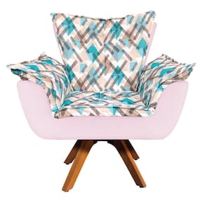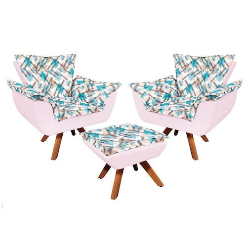 Kit 02 Poltronas e Puff Opala Composê Suede com Estampado Traçado Azul D33 Base Giratória de Madeira D'Rossi