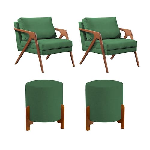 Kit 2 Poltronas Mona Decorativa e 2 Puff Thor Estofado Linho Verde Base Madeira Maciça