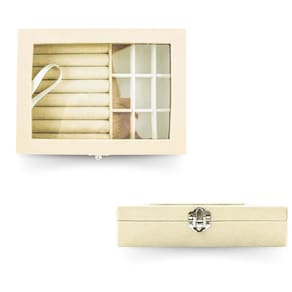 Contém: 02 - porta joias com divisórias removíveis, tampa acrílica e forro de veludo bege