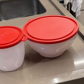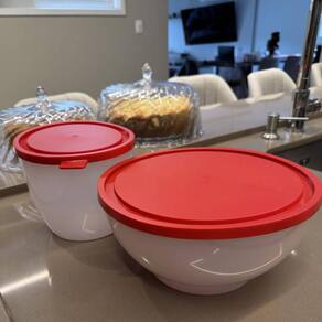 Garantia: 90 dias / Peso de cada: 322g / Cor predominante: vermelho / Referência: 7798140526001; Dimensões de cada: 23,3cm (D) x 11,4cm (A); Capacidade de cada: 3,1L; Conteúdo: 2 potes com tampa; Materiais: polipropileno e PEBD.