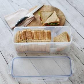 Único no mercado, o Porta Pão de Forma Hermético da Lock&Lock foi desenvolvido especialmente para o armazenamento de pacotes de pão de forma, podendo comportar também pão francês, bolos ou até mesmo outros alimentos. É um pote grande, com capacidade para 5 litros e cabe com sobra um pacote grande de pão.